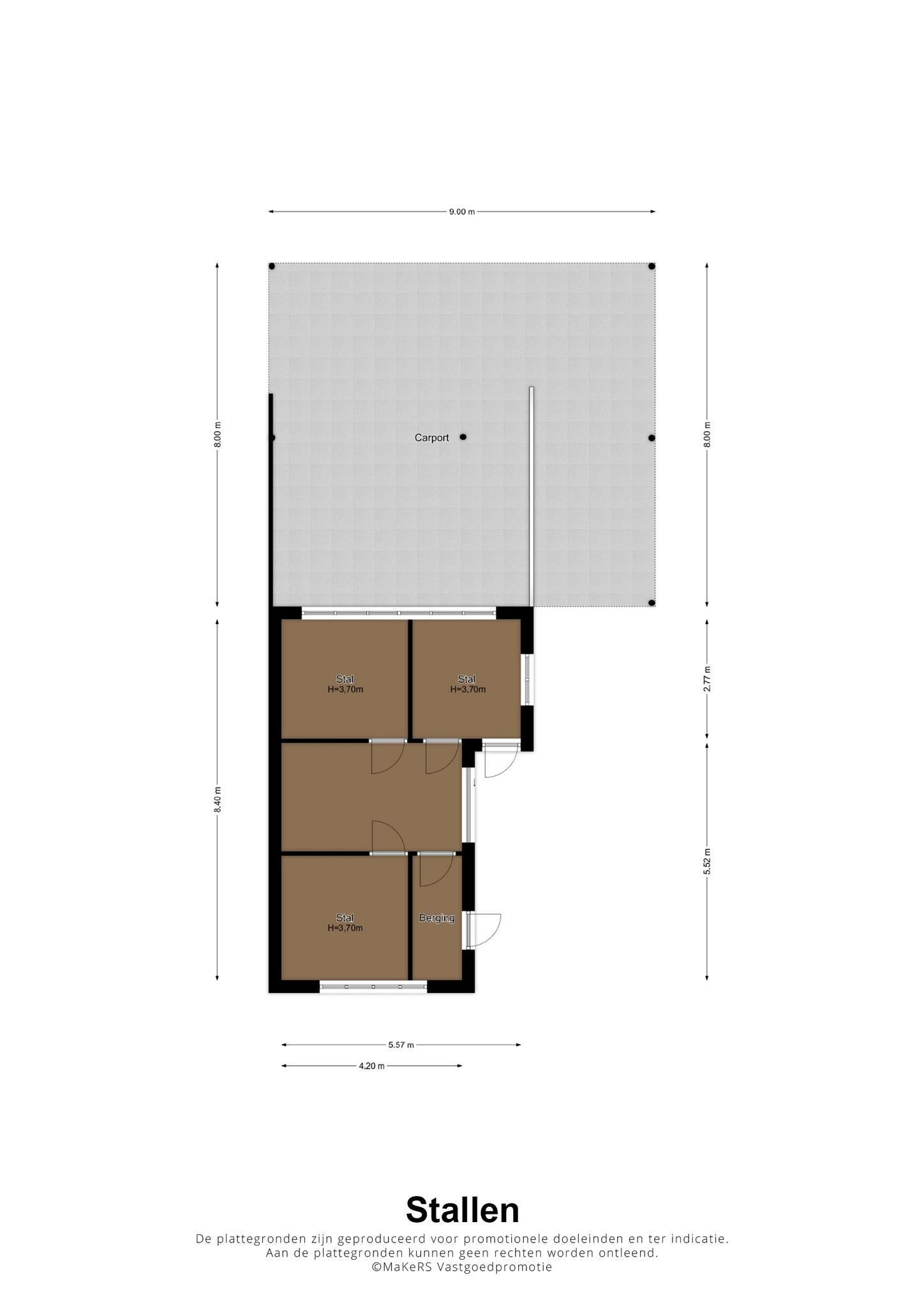 Achter het woonhuis staat het stallengebouw met een hooiopslag en carport. Er zijn twee paardenboxen Aan de achterzijde van de stallen is de hooiopslag die, samen met de carport, circa 8,00 x 9,00 meter groot is.