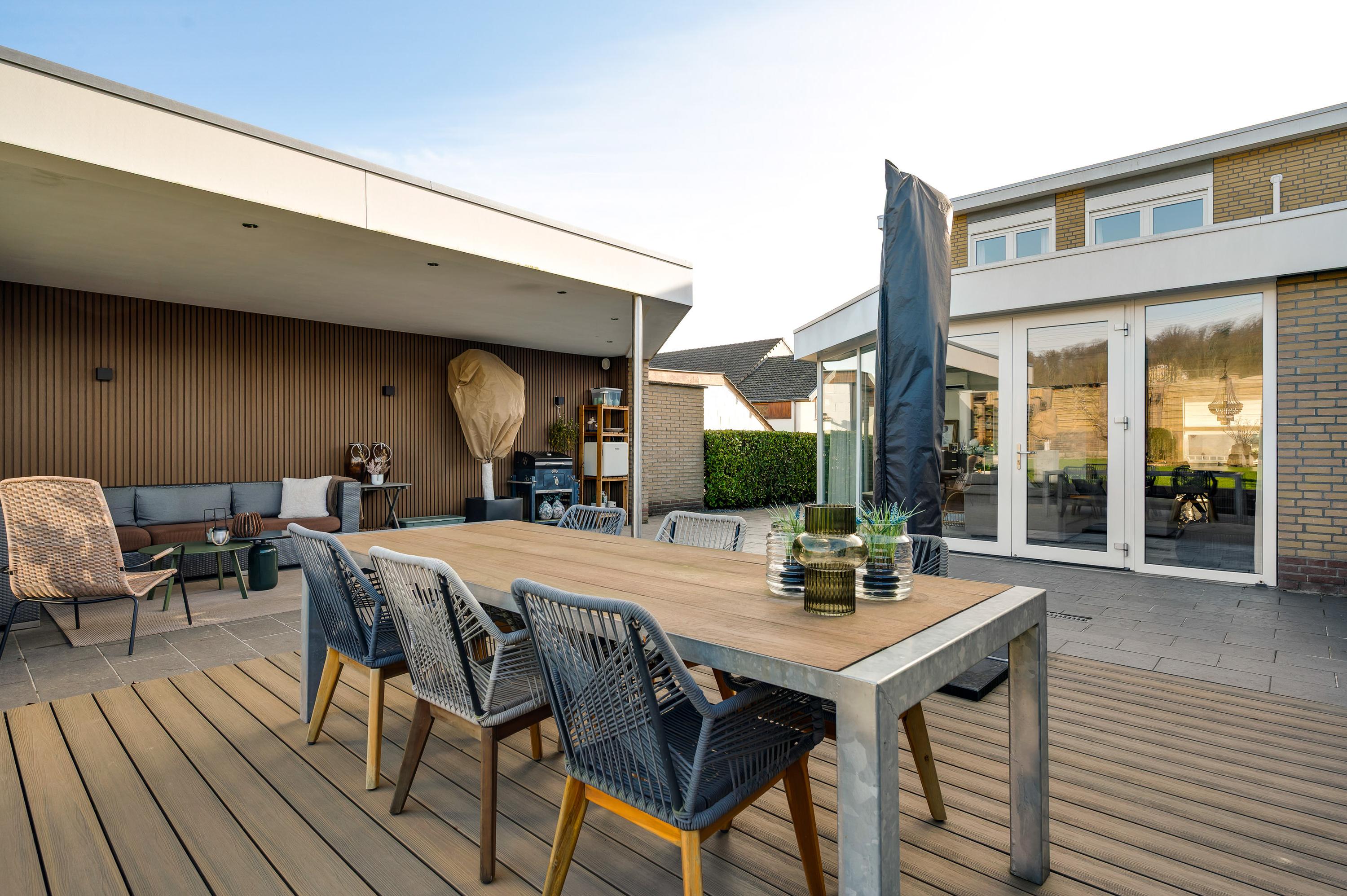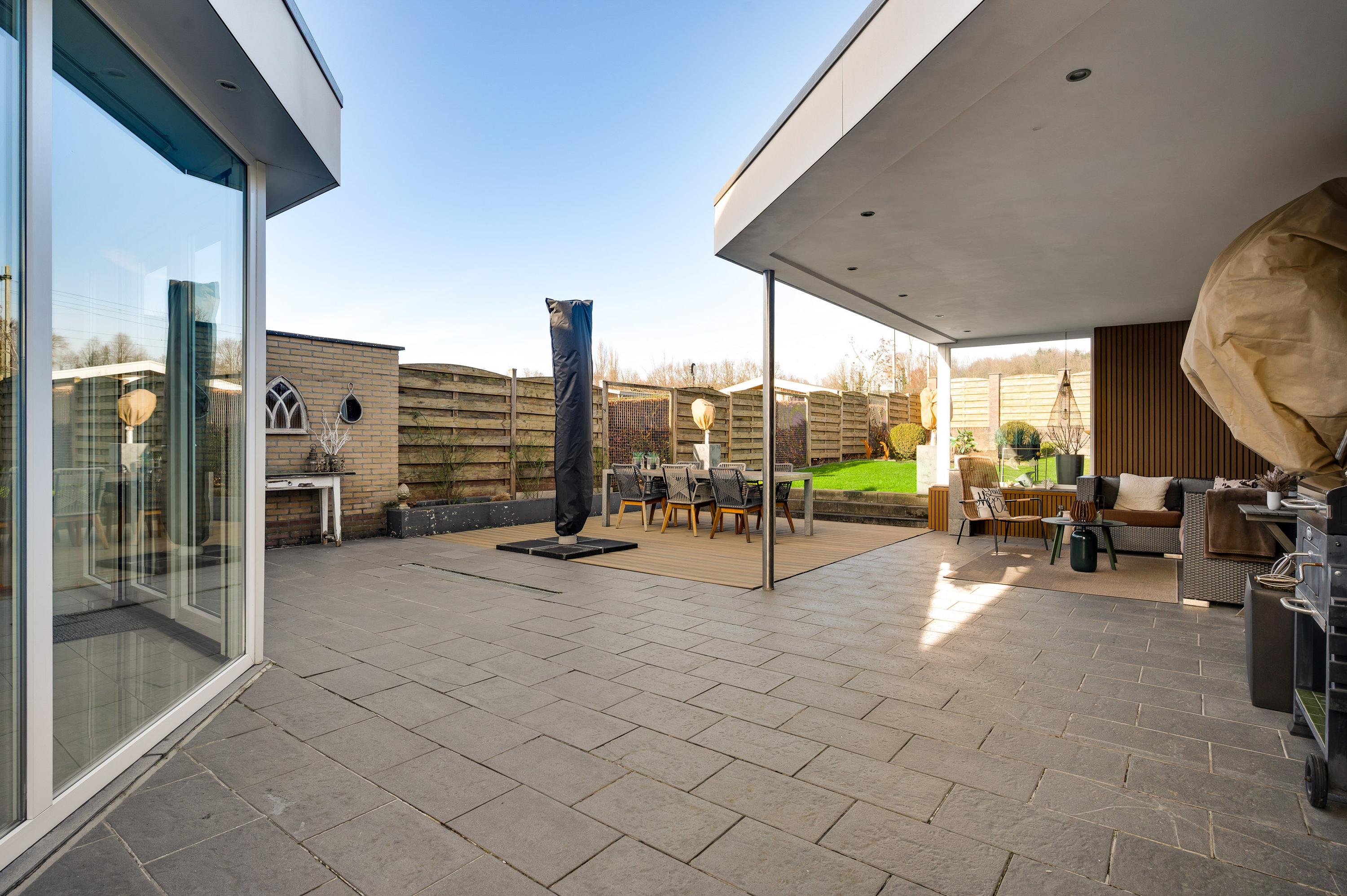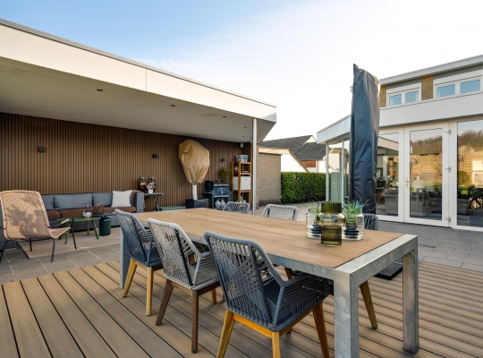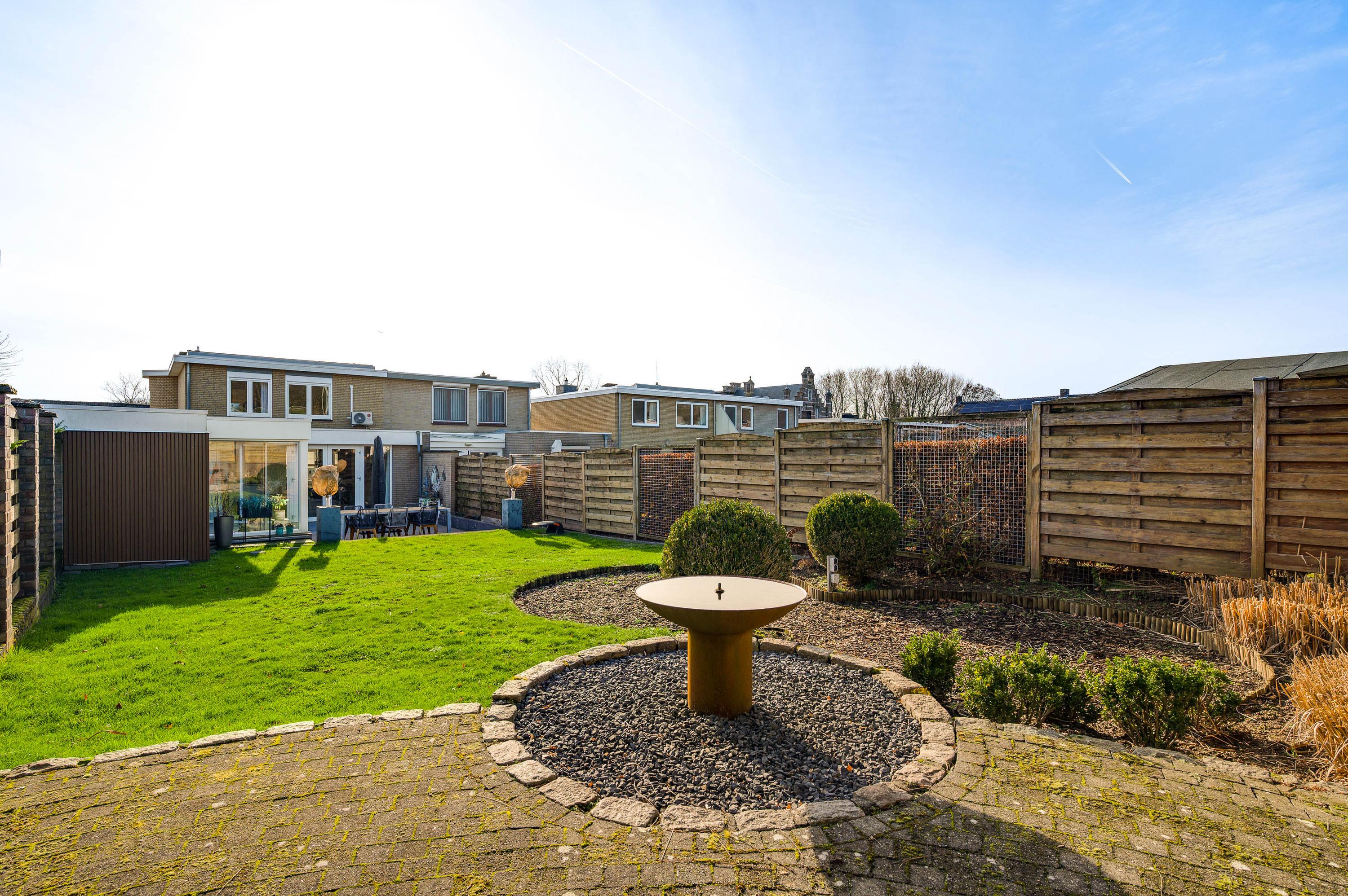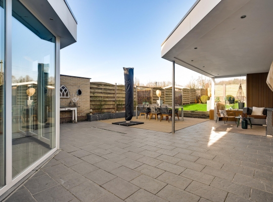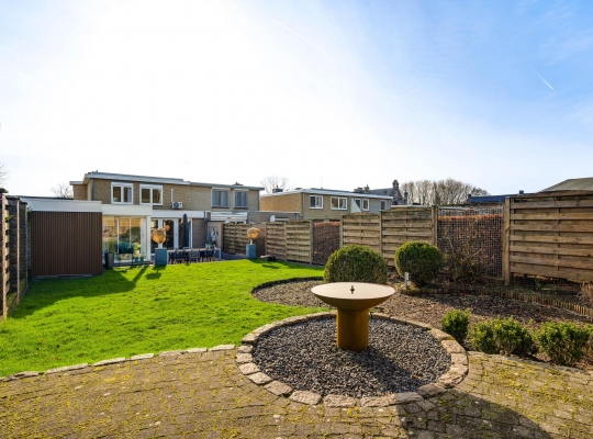 Een van de ramen in de keuken biedt uitzicht op de zijtuin, die de voor- en achtertuin met elkaar verbindt. Groene hagen en borders met beplanting zorgen voor een fraai geheel. Blikvanger in de achtertuin is het overdekte terras, dat een geheel vormt met het grote terras. Het achterste deel van de tuin is ingericht met een gazon en beplanting, perfect voor spelende kinderen en om zelf van te genieten.