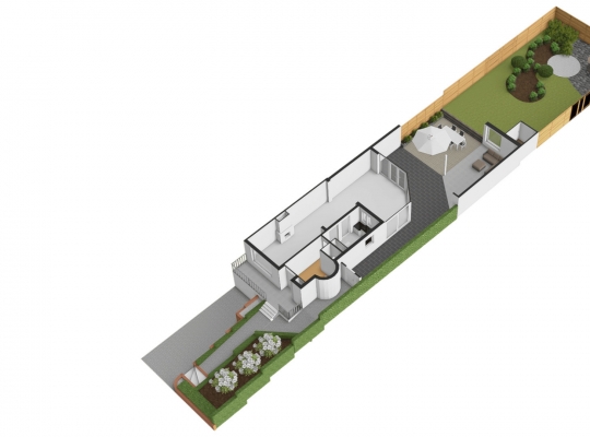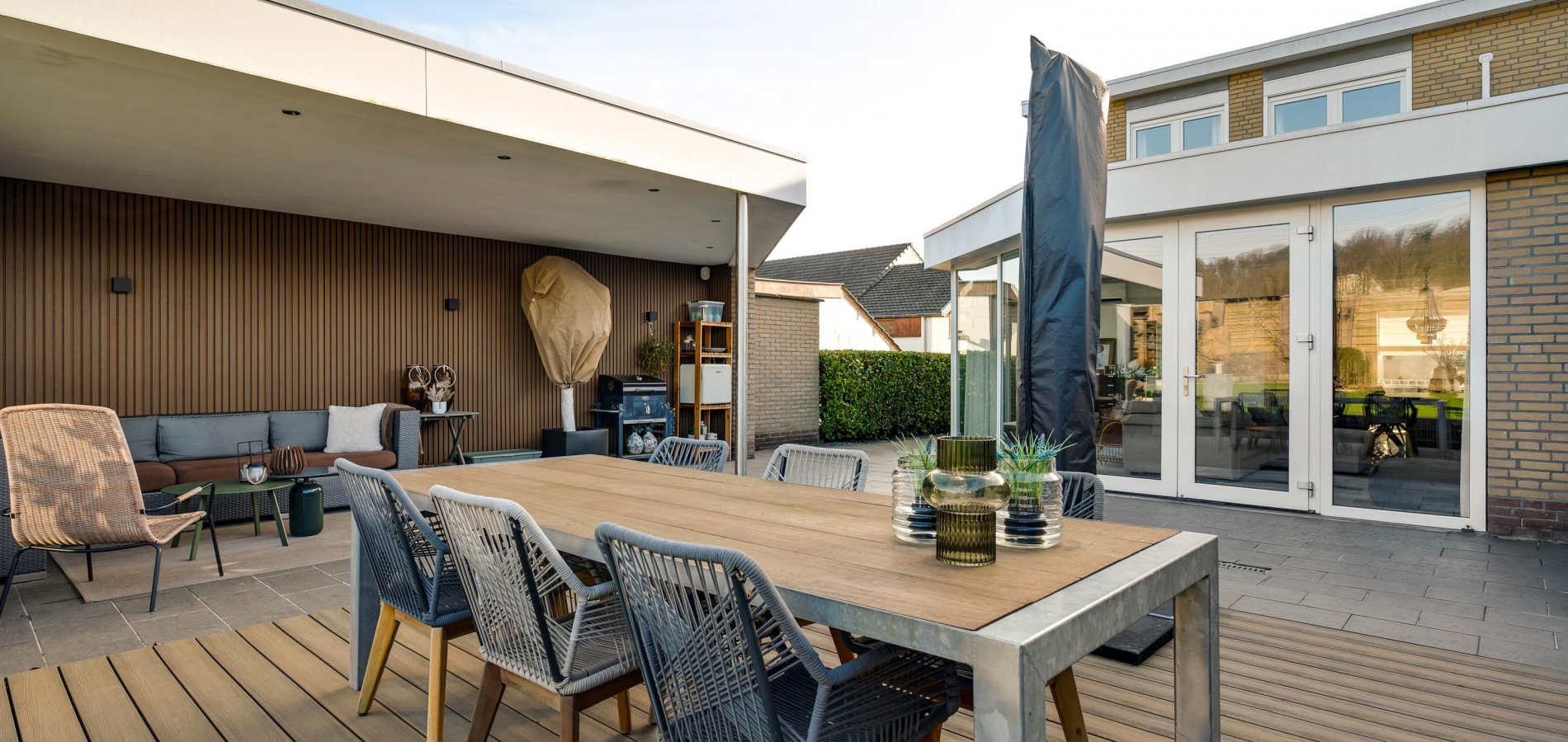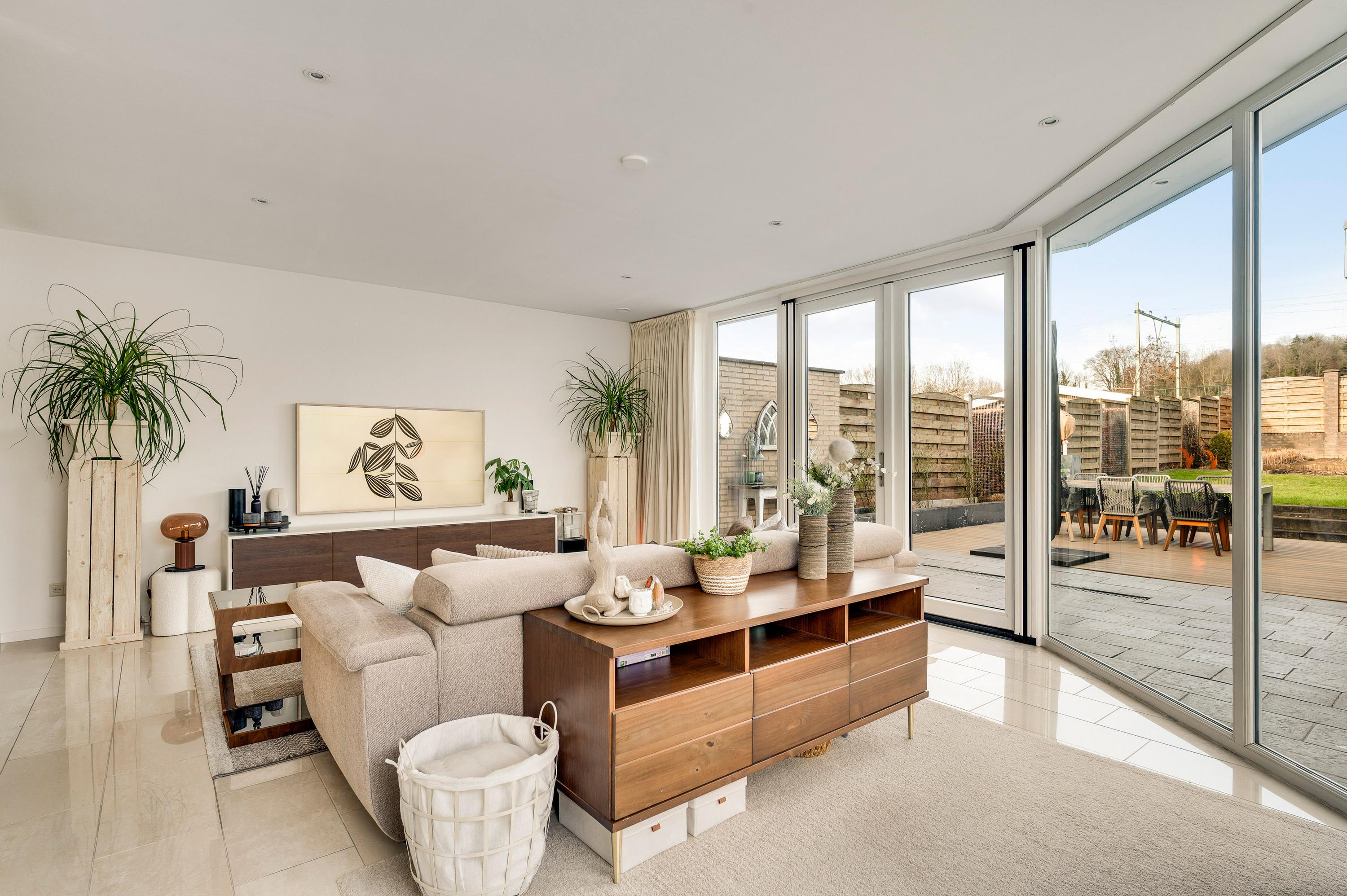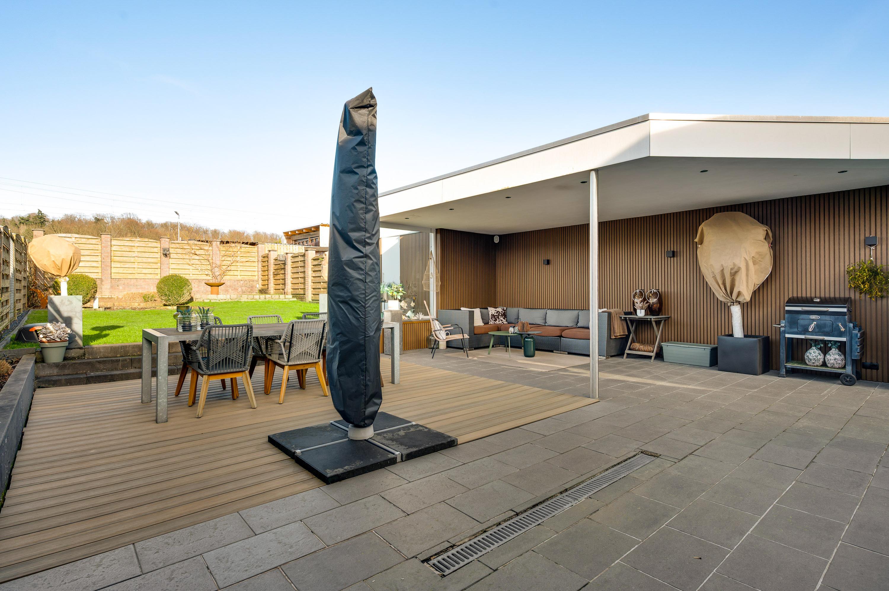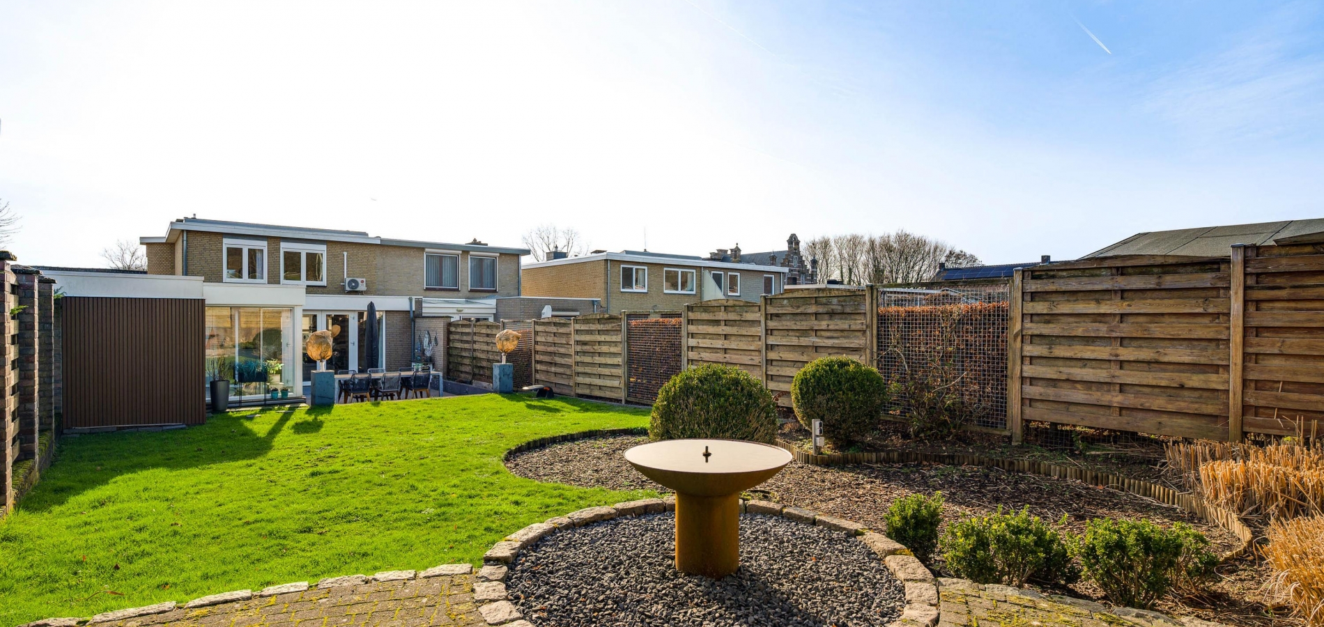 Een van de ramen in de keuken biedt uitzicht op de zijtuin, die de voor- en achtertuin met elkaar verbindt. Groene hagen en borders met beplanting zorgen voor een fraai geheel. Blikvanger in de achtertuin is het overdekte terras, dat een geheel vormt met het grote terras. Het achterste deel van de tuin is ingericht met een gazon en beplanting, perfect voor spelende kinderen en om zelf van te genieten.