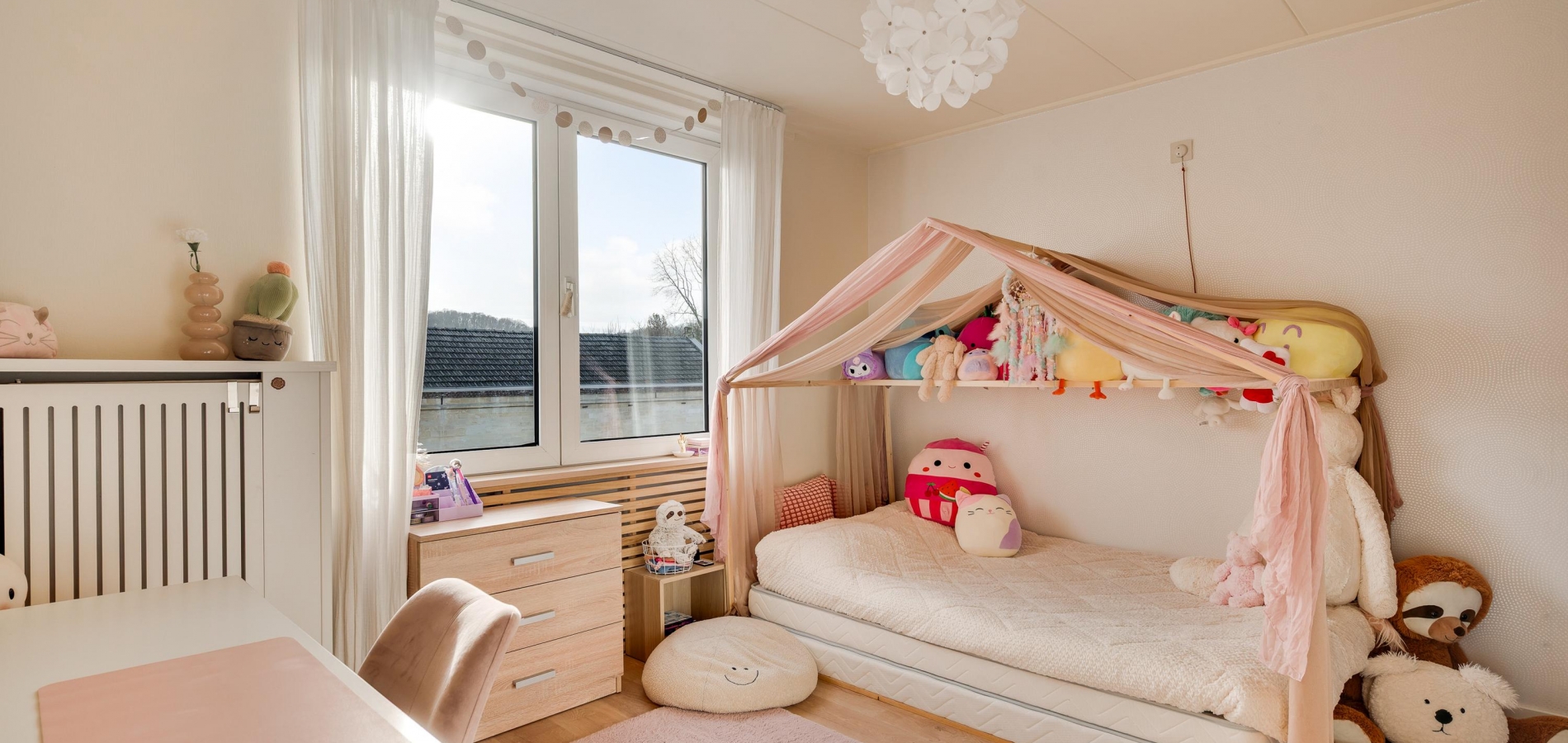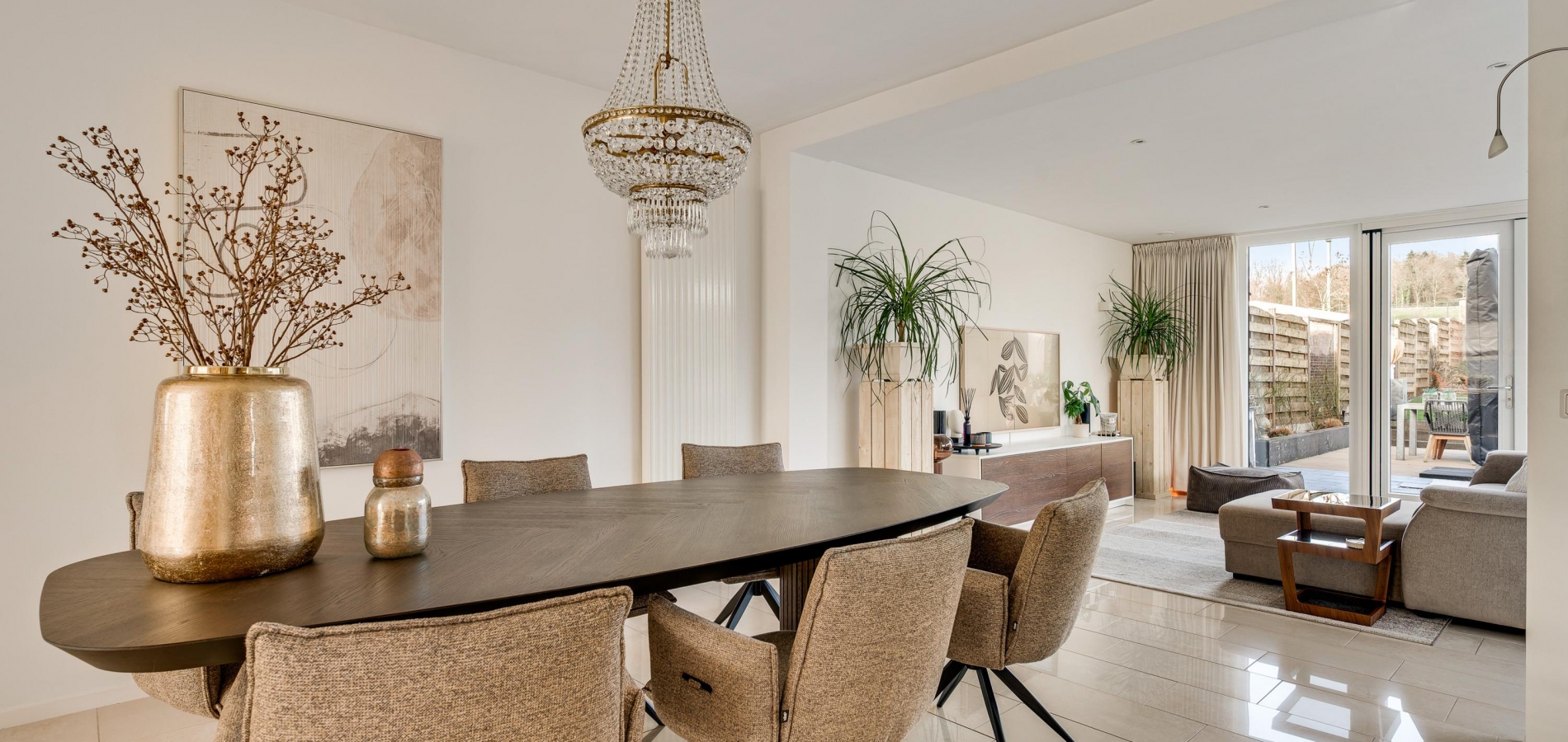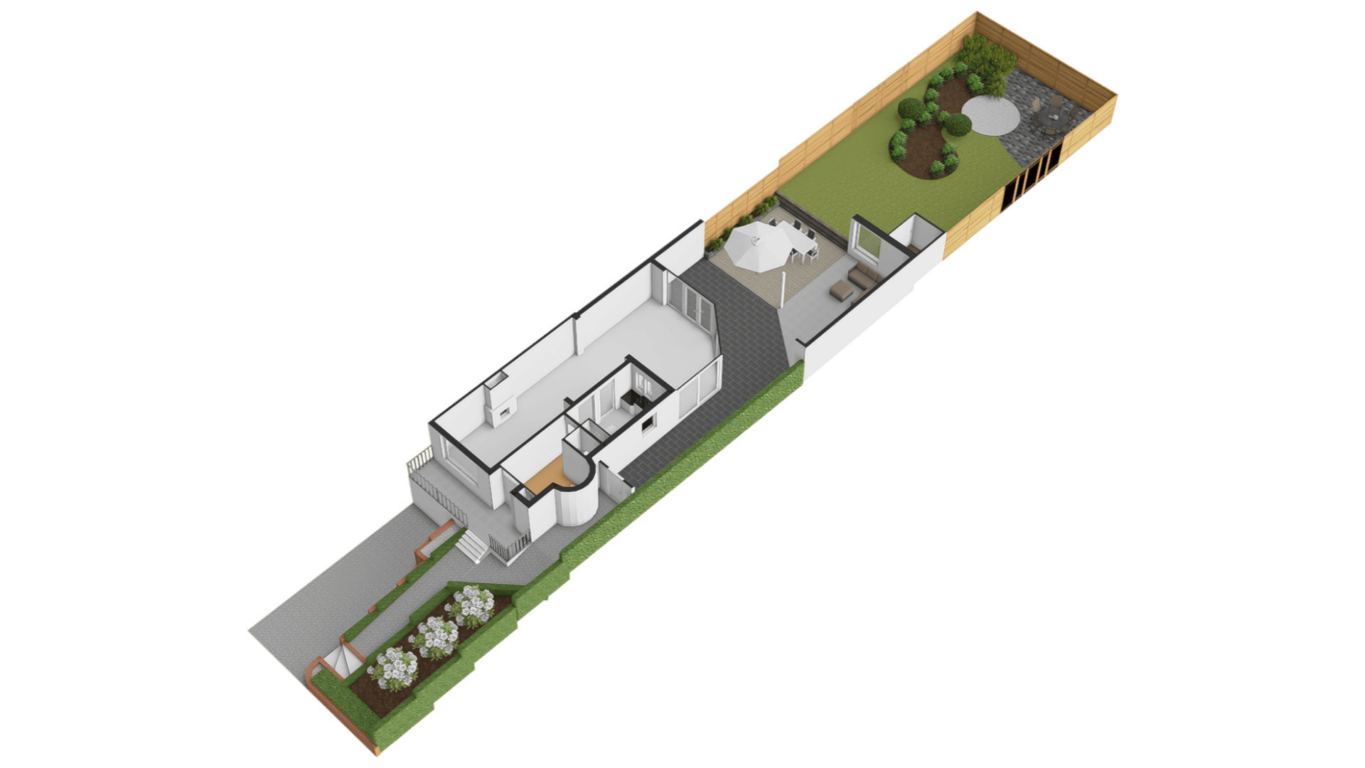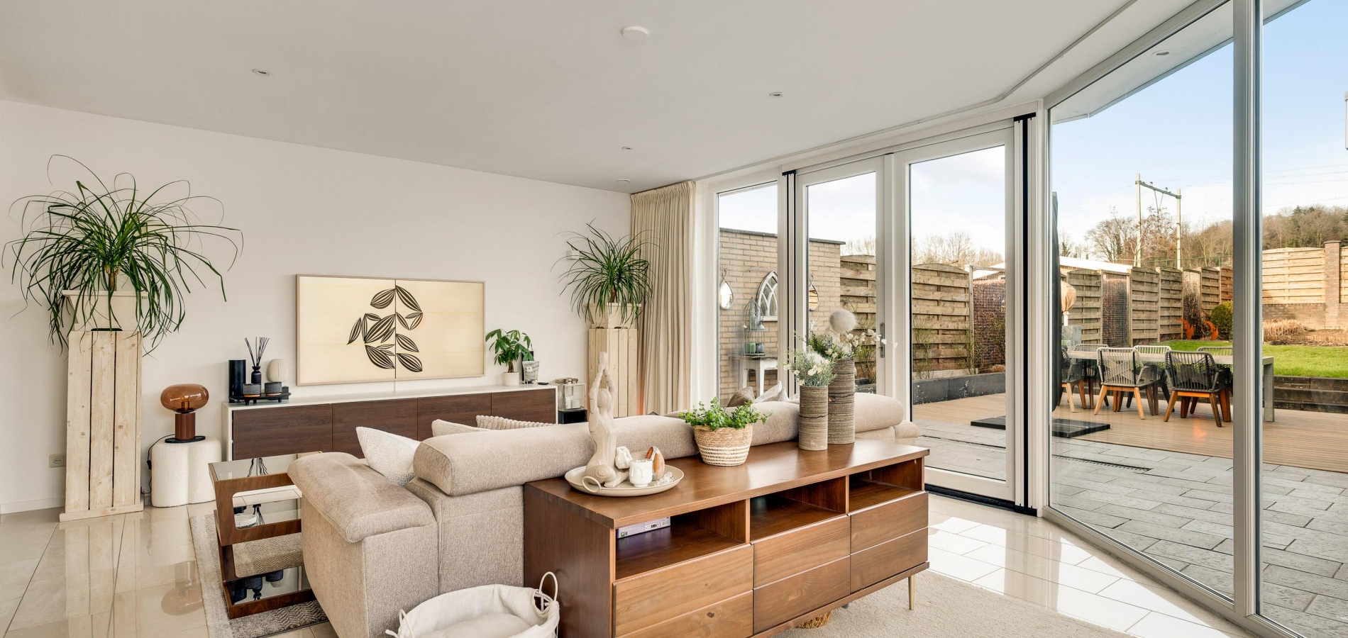 Een van de ramen in de keuken biedt uitzicht op de zijtuin, die de voor- en achtertuin met elkaar verbindt. Groene hagen en borders met beplanting zorgen voor een fraai geheel. Blikvanger in de achtertuin is het overdekte terras, dat een geheel vormt met het grote terras. Het achterste deel van de tuin is ingericht met een gazon en beplanting, perfect voor spelende kinderen en om zelf van te genieten.