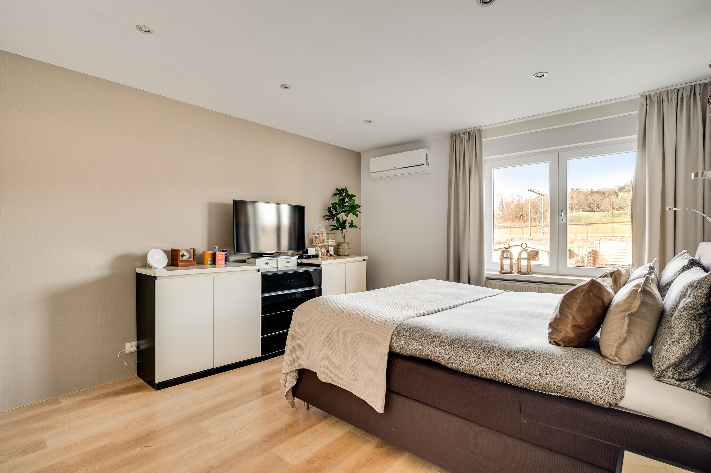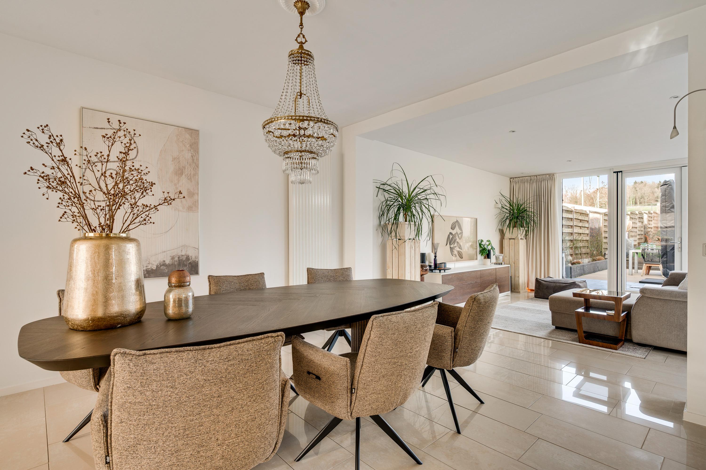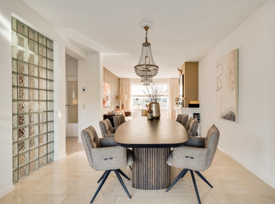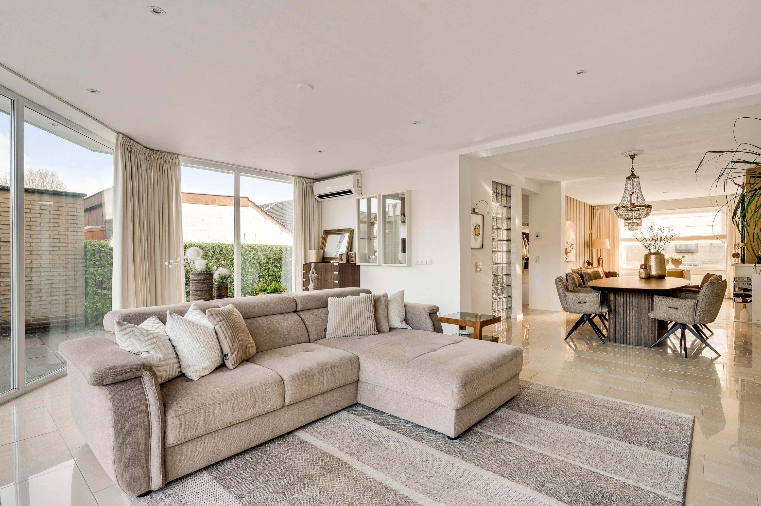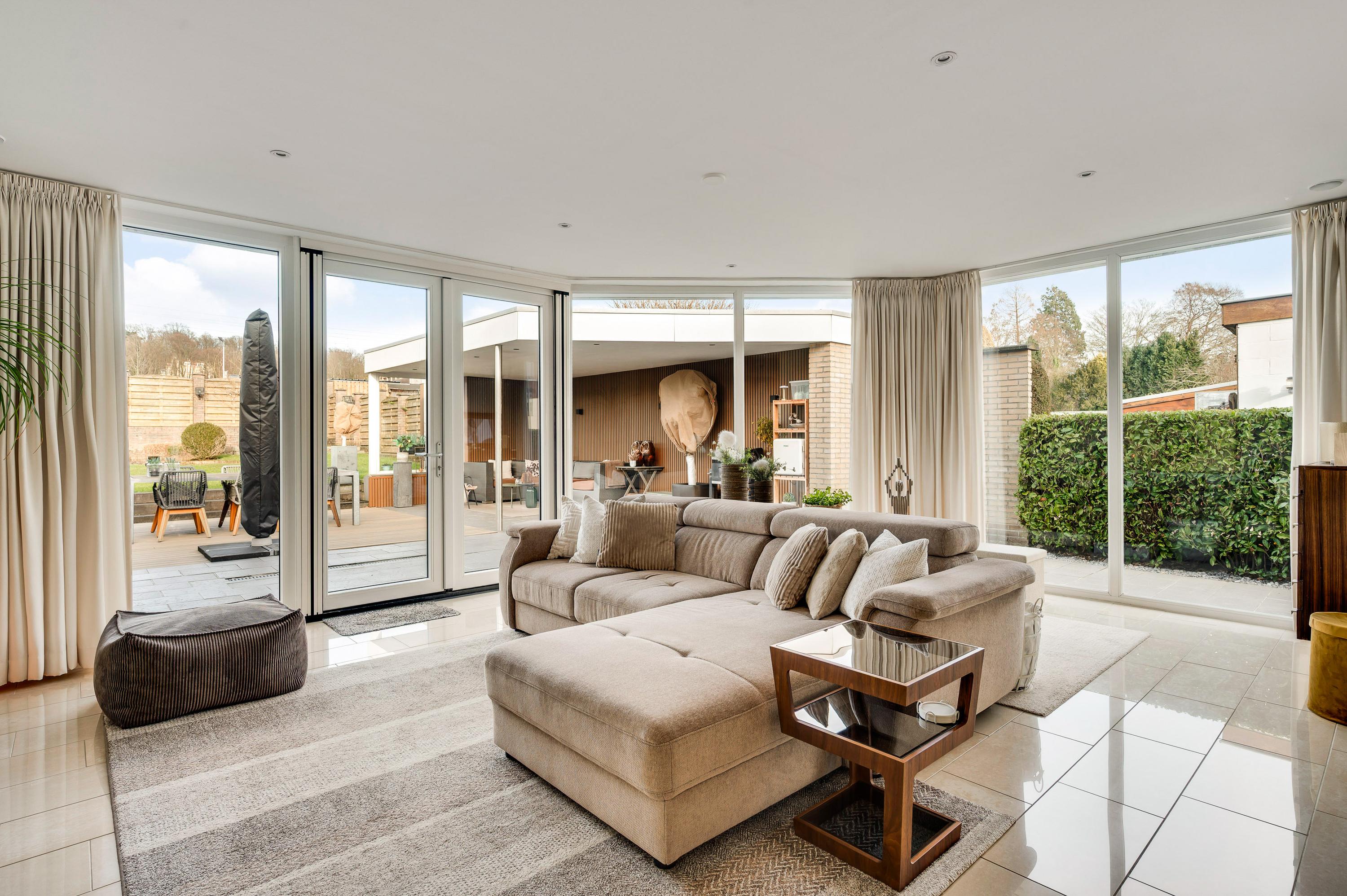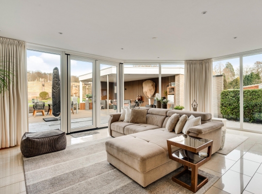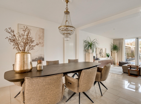 De woon-/eetkamer is aan de achterzijde fors uitgebouwd, waardoor er een leefruimte van circa 55 m2 is ontstaan. Het zitgedeelte is aan de voorzijde, bij de open haard, en het eetgedeelte grenst aan de halfopen keuken. De fraaie aanbouw, met ramen tot vloerhoogte en openslaande tuindeuren, is ingericht als tv-ruimte. In de hoek van deze ruimte hangt een airco-unit, die kan koelen en verwarmen.