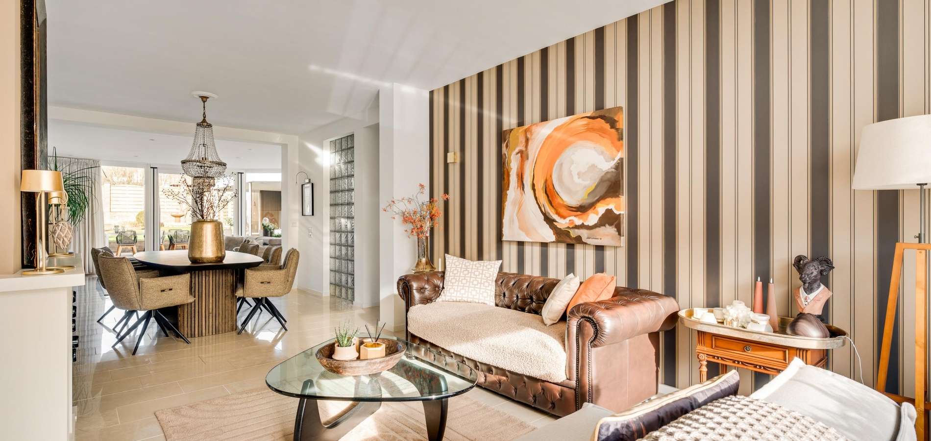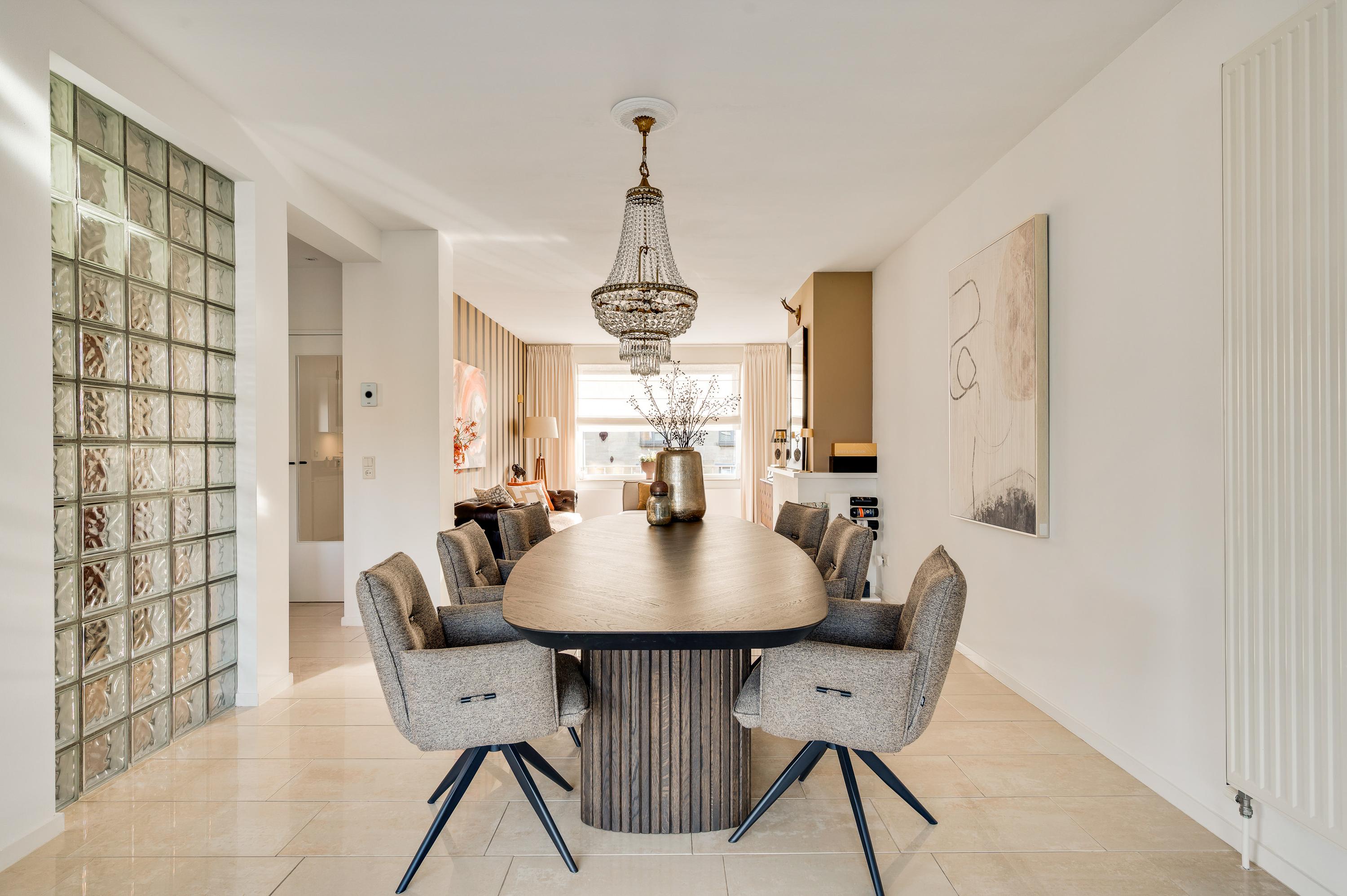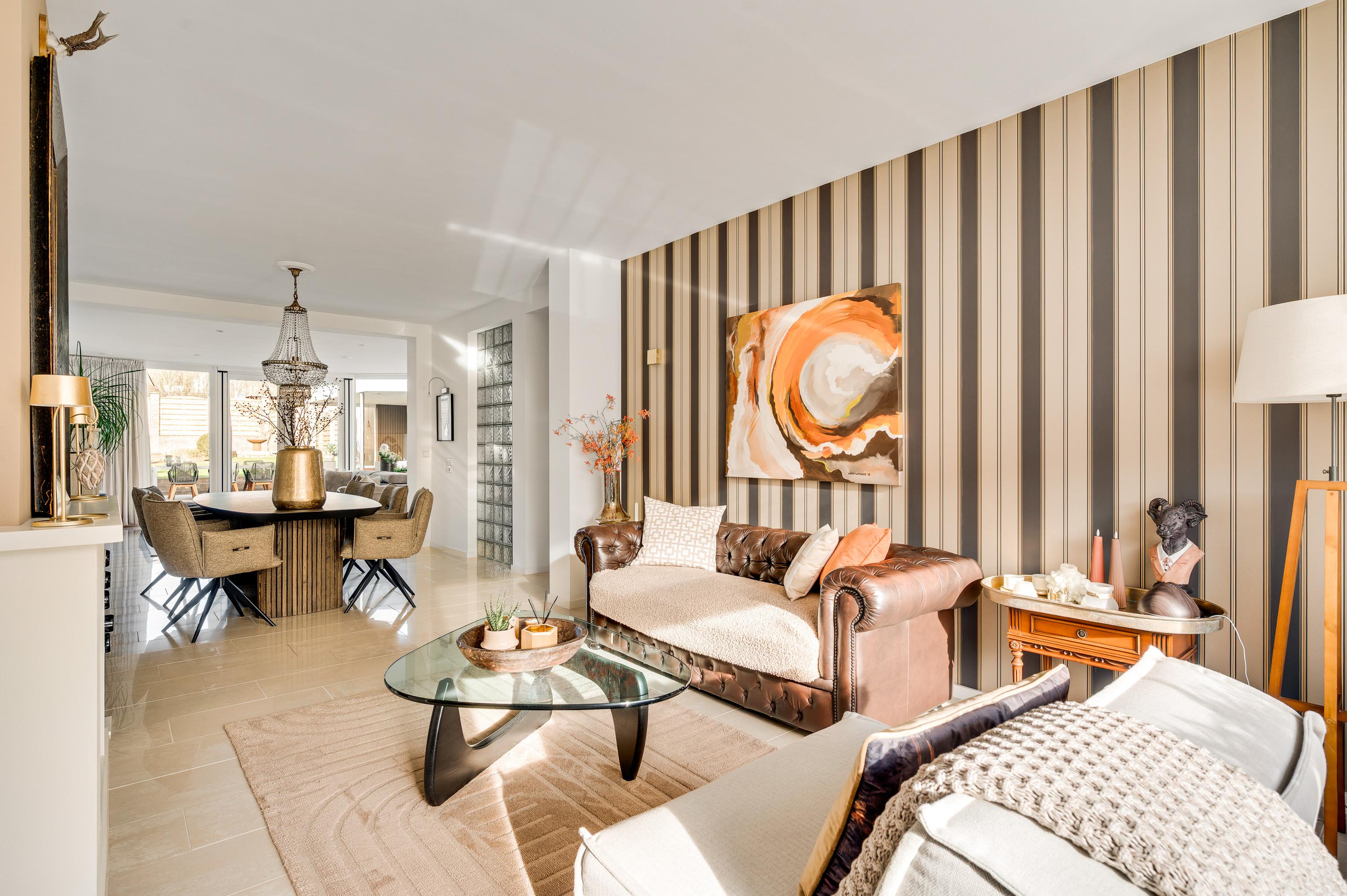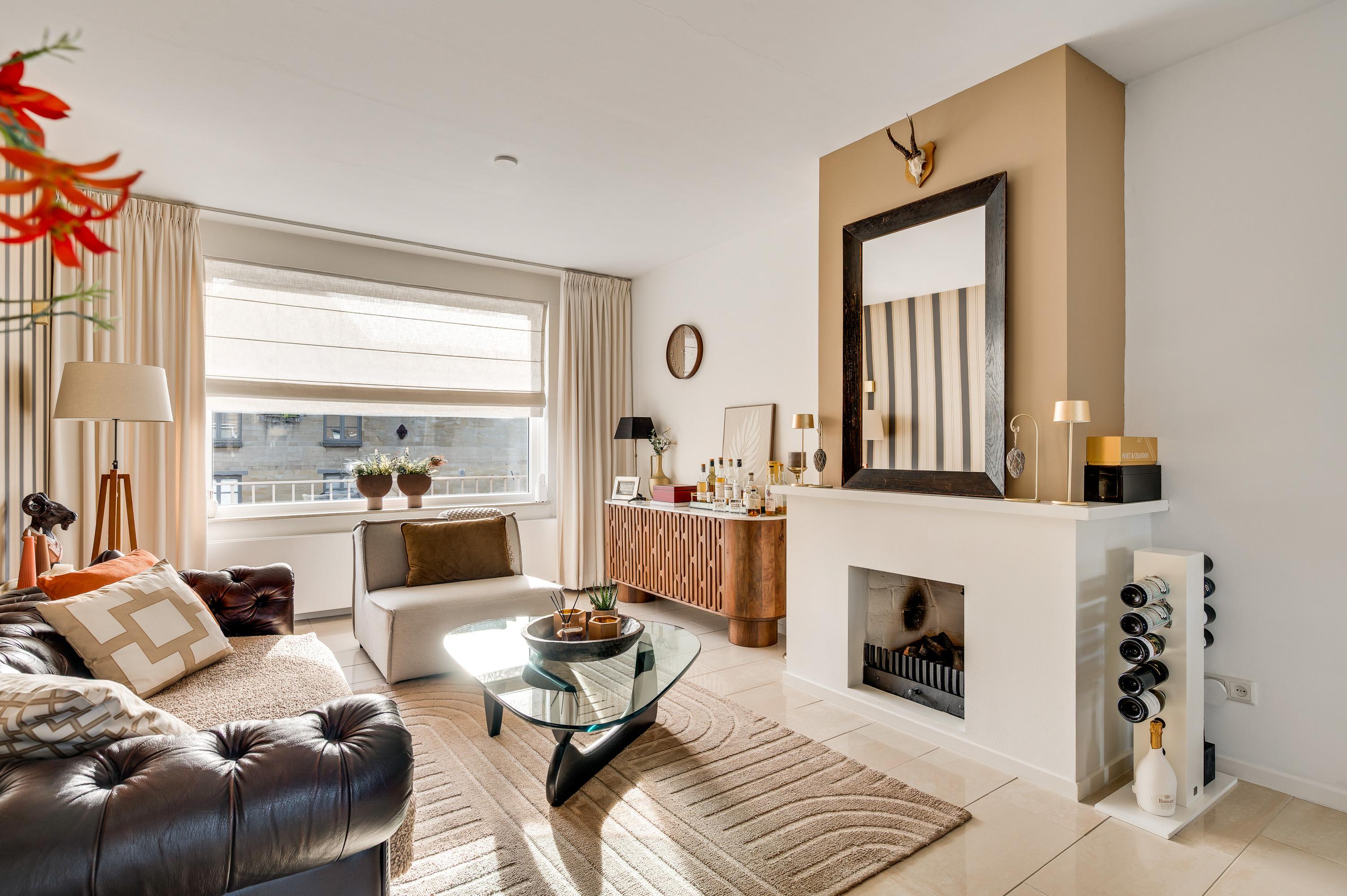 De woon-/eetkamer is aan de achterzijde fors uitgebouwd, waardoor er een leefruimte van circa 55 m2 is ontstaan. Het zitgedeelte is aan de voorzijde, bij de open haard, en het eetgedeelte grenst aan de halfopen keuken. De fraaie aanbouw, met ramen tot vloerhoogte en openslaande tuindeuren, is ingericht als tv-ruimte. In de hoek van deze ruimte hangt een airco-unit, die kan koelen en verwarmen.