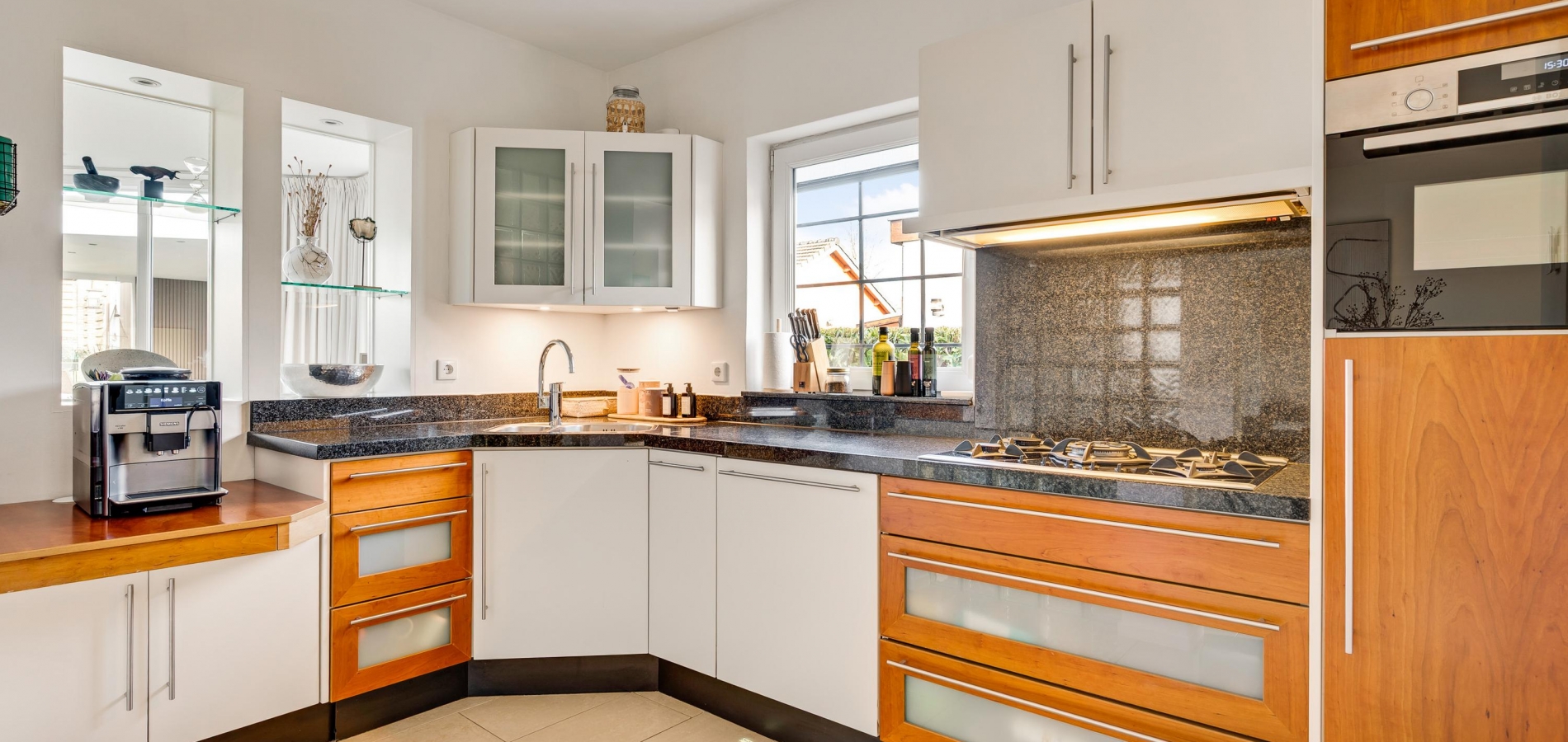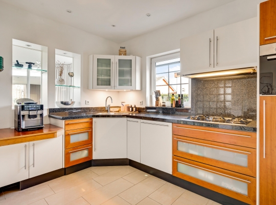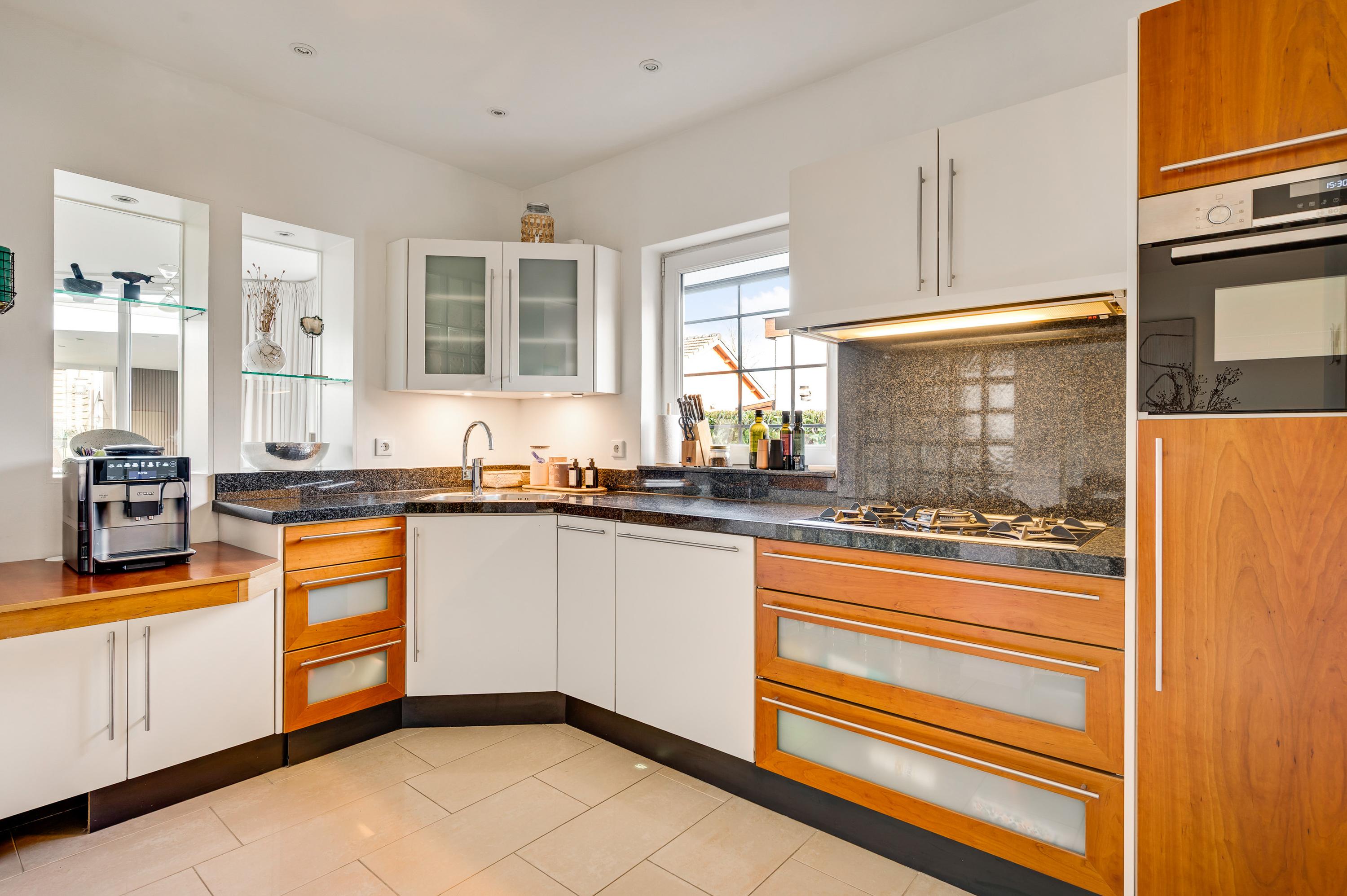 Vanuit de hal en woonkamer is de keuken (circa 4,01 x 2,28) te bereiken, waar een hoekopstelling met een granieten aanrechtblad staat. De gaskookplaat, afzuigkap, combi-oven, koelkast en vaatwasser zijn ingebouwd waardoor u direct aan de slag kunt met koken en bakken.