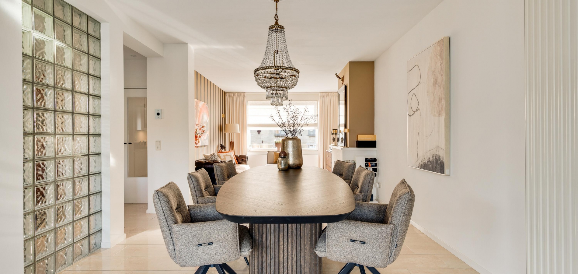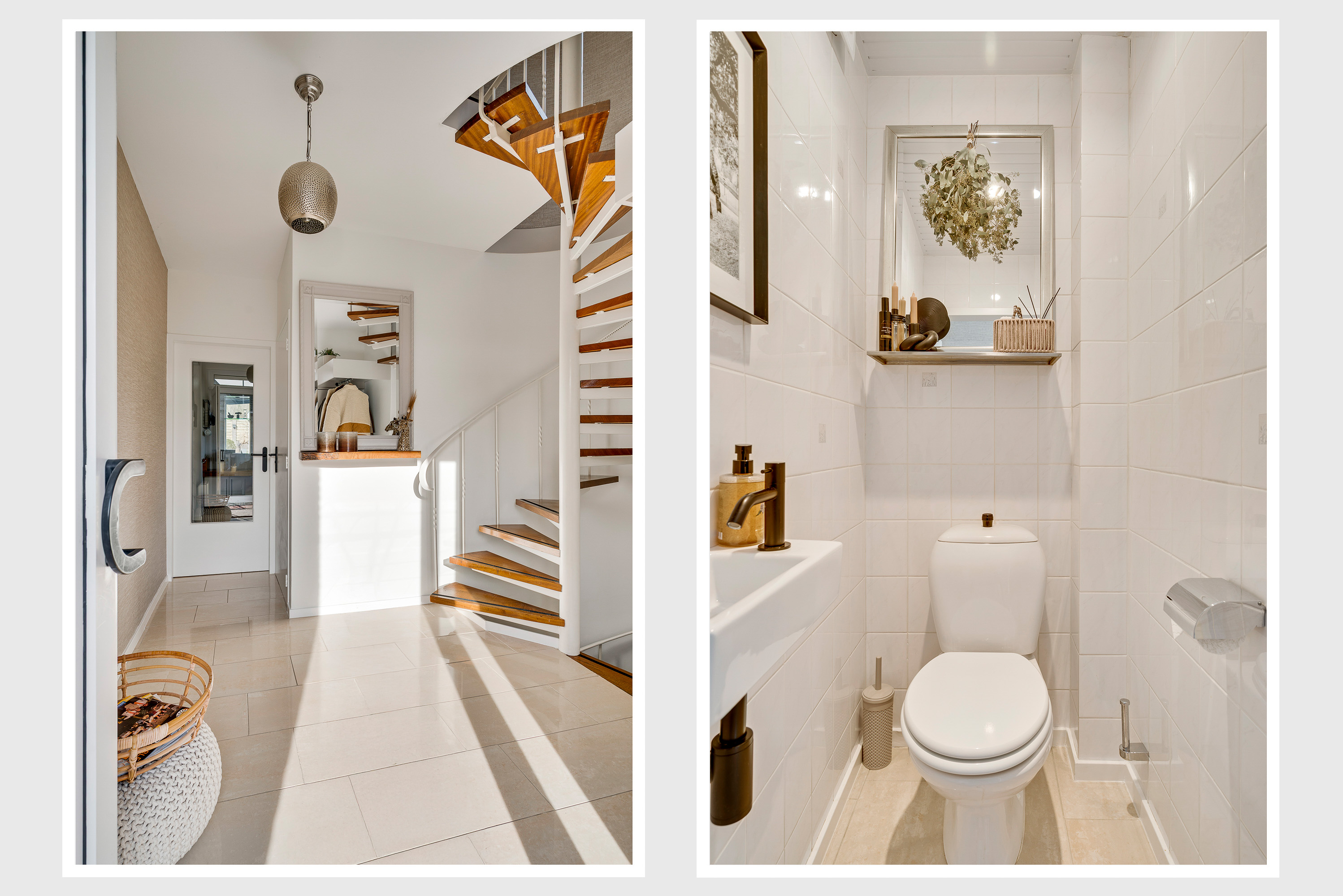 Via het pad in de tuin loopt u, twee korte buitentrappen, naar de entree van deze fraaie woning. In de hal (circa 2,77 x 2,28) ligt, net als op bijna de hele begane grond, een marmeren vloer en lichte kleuren maken de hal heel ruimtelijk. Blikvanger zijn de sierlijke trappen, naar het souterrain en de eerste verdieping, en vanuit de hal is er toegang tot de toiletruimte met fonteintje.