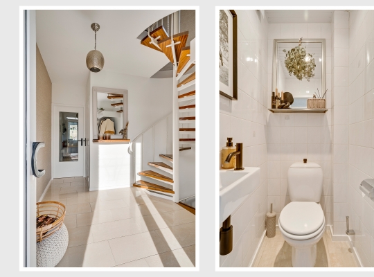 Niet alleen op de begane grond, maar ook op de eerste verdieping is dit huis heel sfeervol en smaakvol verbouwd. Vanaf de overloop is er toegang tot drie slaapkamers, de badkamer en een separate toiletruimte.