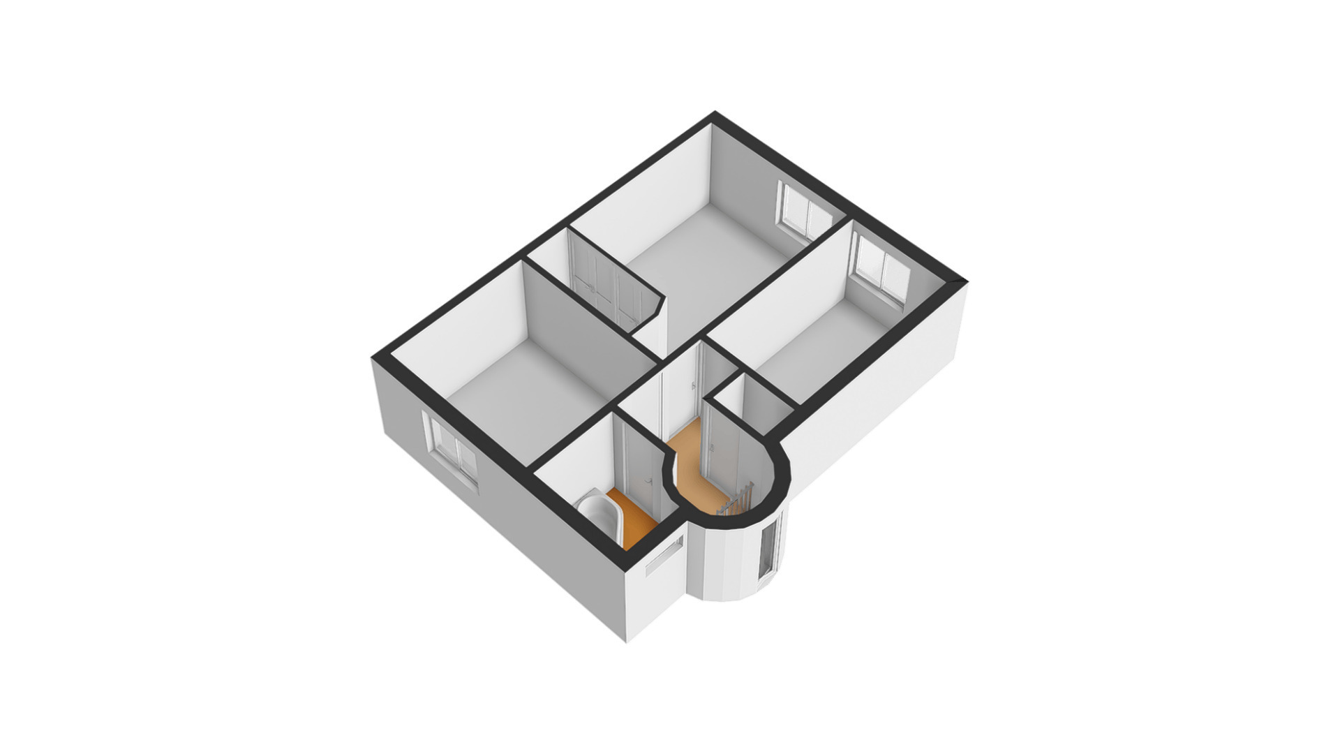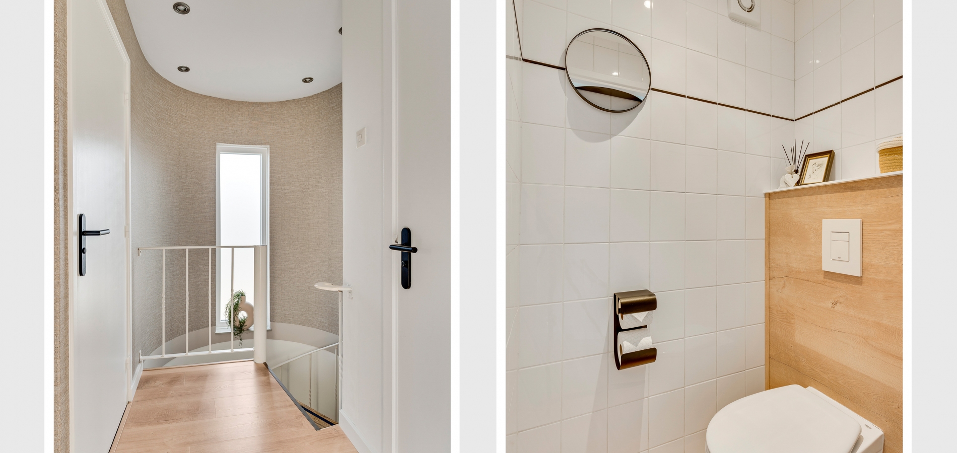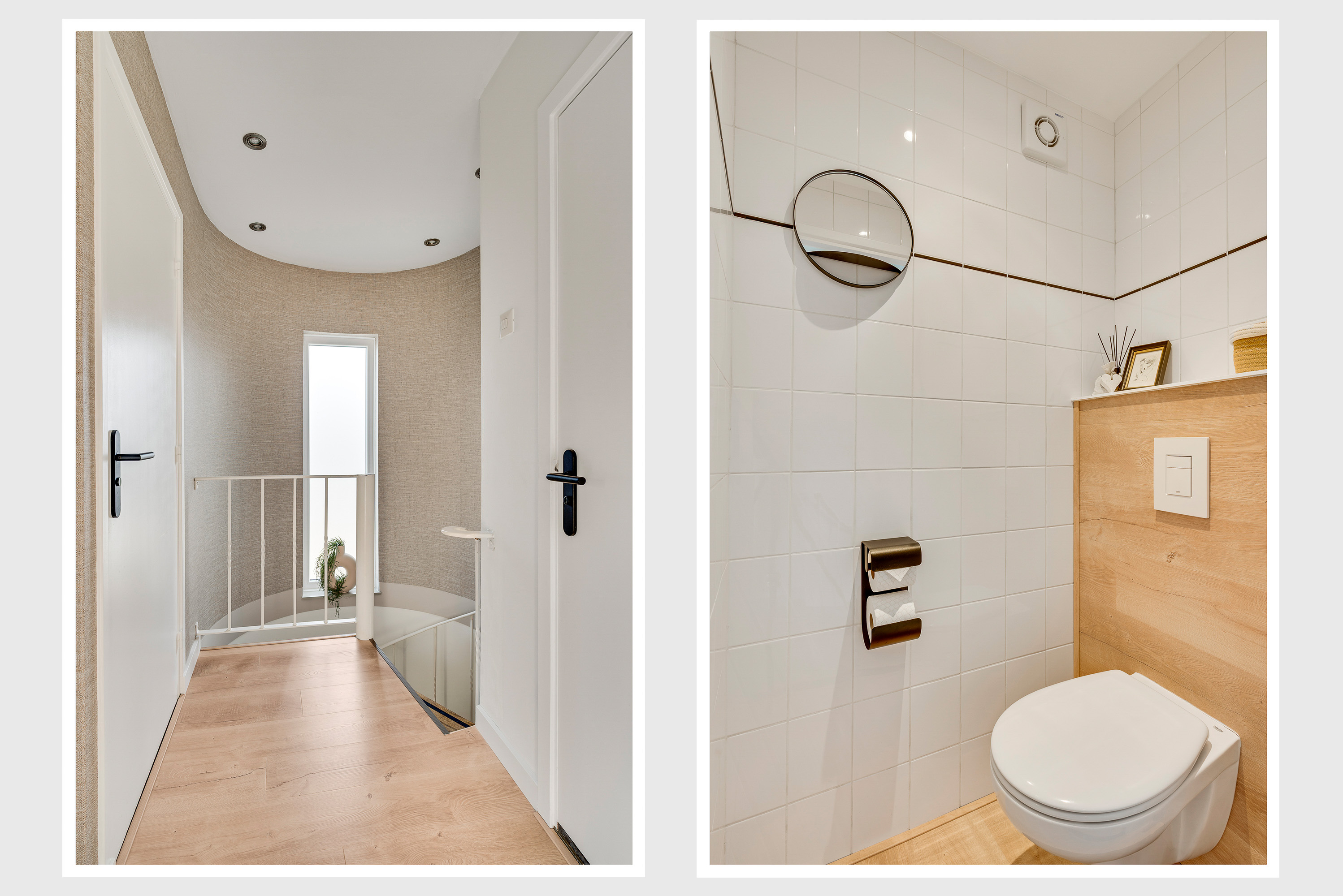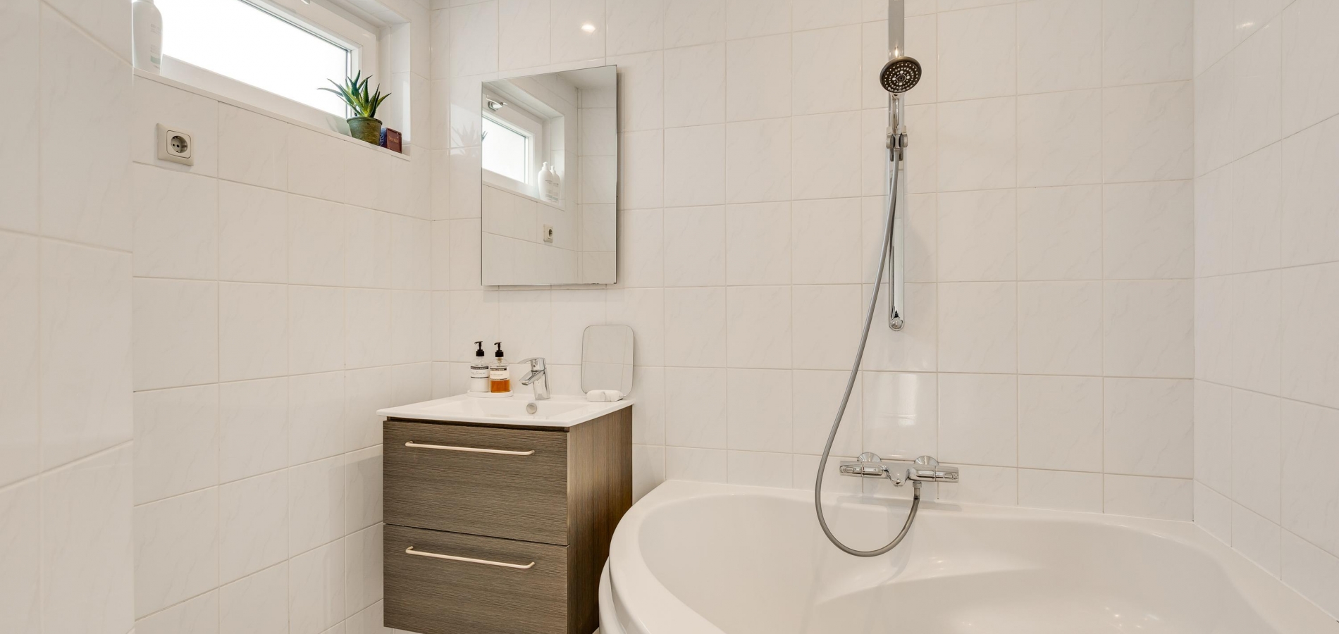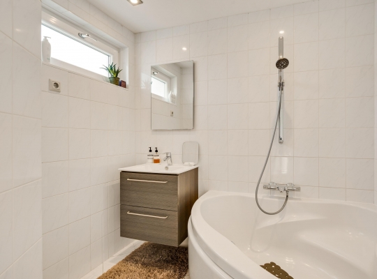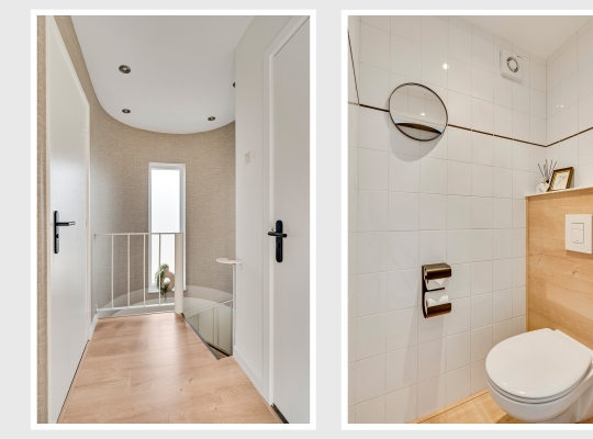 De toiletruimte met wandcloset is uitgevoerd in wit met houtlook accenten, wat voor een fraai geheel zorgt. Aan de andere zijde van de overloop is de badkamer (circa 2,26 x 1,88/1,26) met een hoekbad en een wastafelmeubel.